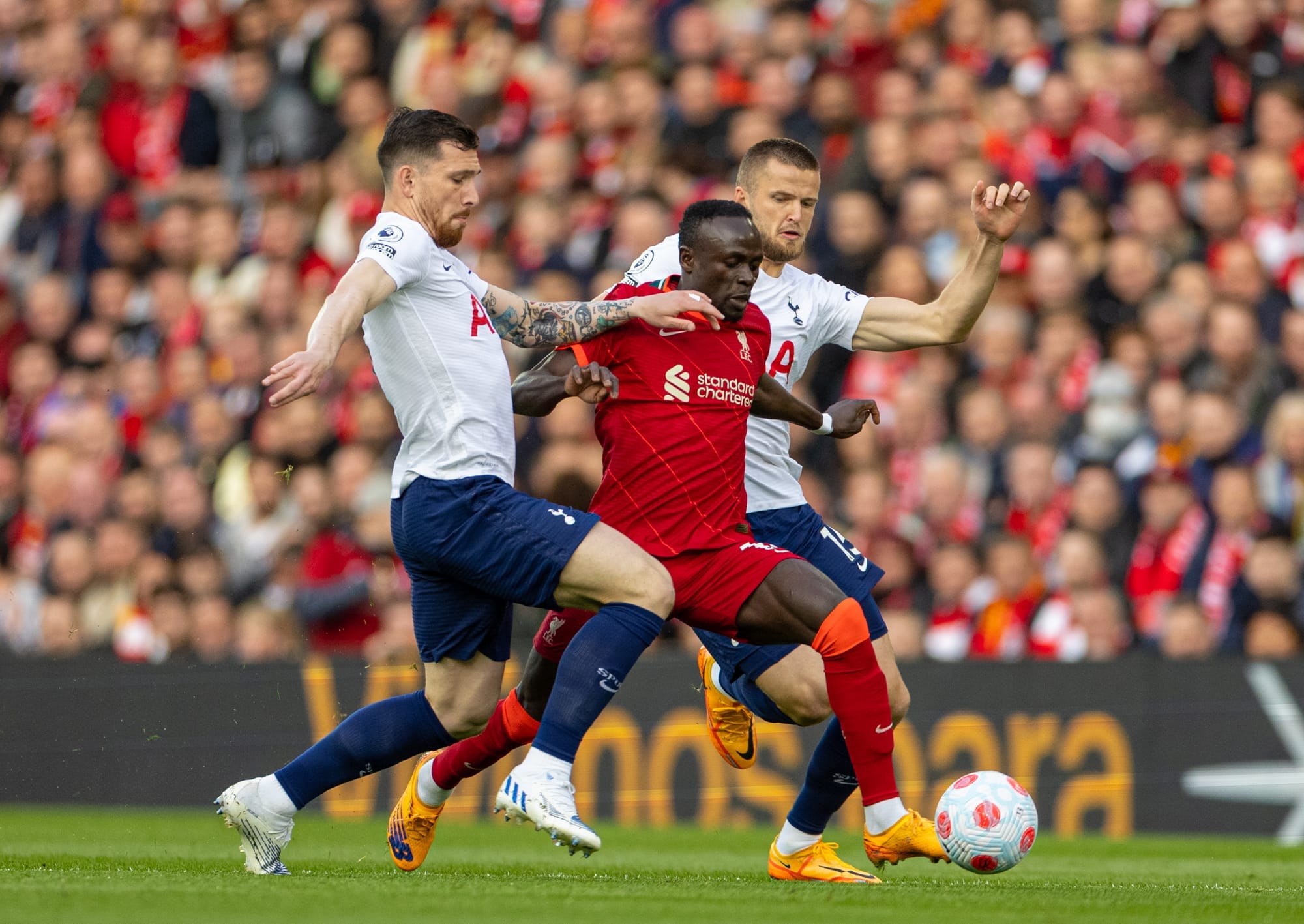 1v1 or 1v2 Situations: Players being closed down by one or more opponents, such as featured image where Sadio Mané is tightly marked by two Tottenham defenders.